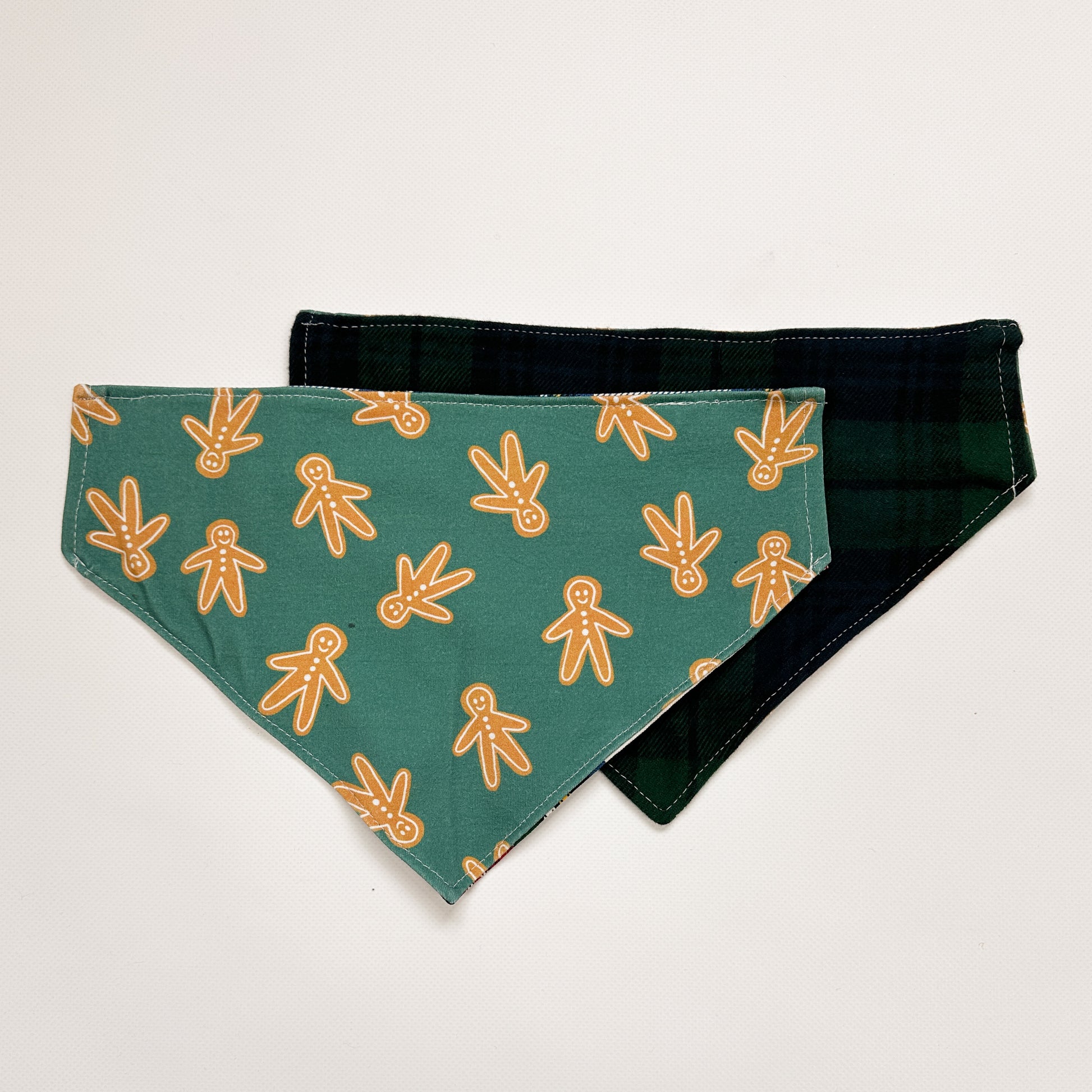 Reversible Bandana that slips on the pups collar. One side is Gingerbread Men! The other side is a Green + Blue plaid flannel.