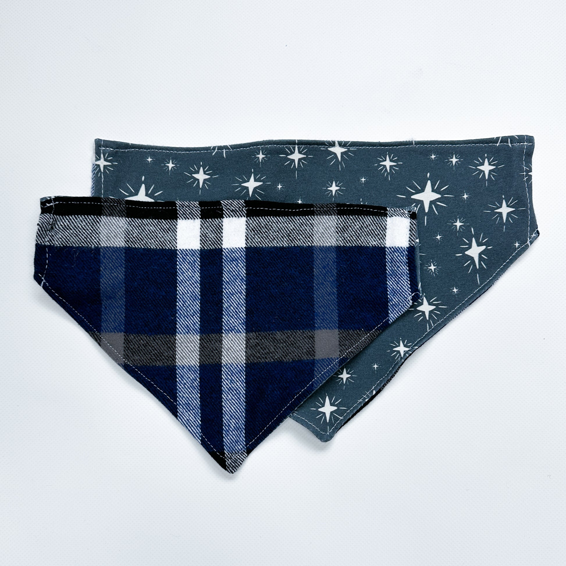 Reversible Bandana that slips on the pups collar. One side is a blue base with seasonal stars. The other side is a black, blue and white plaid flannel.